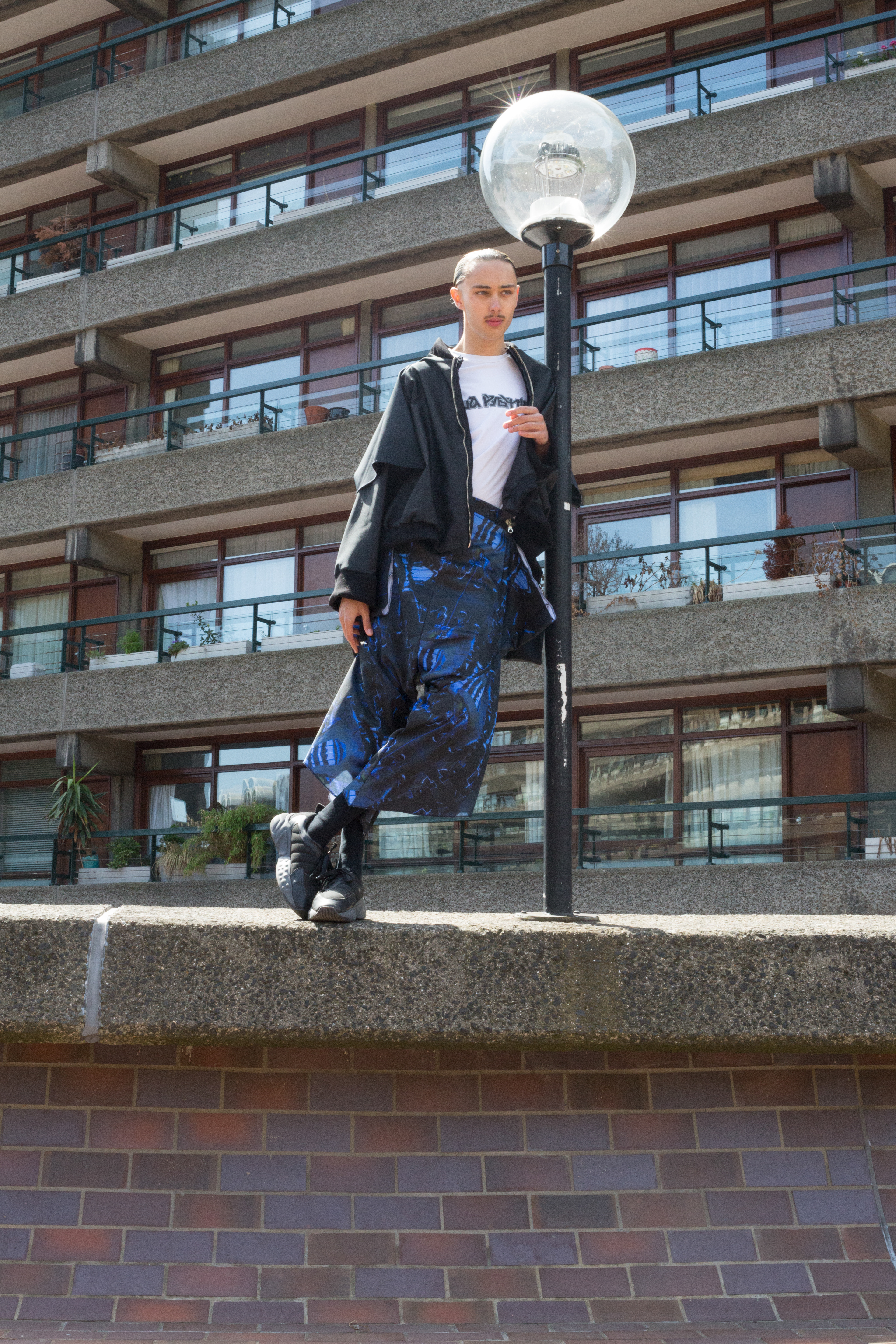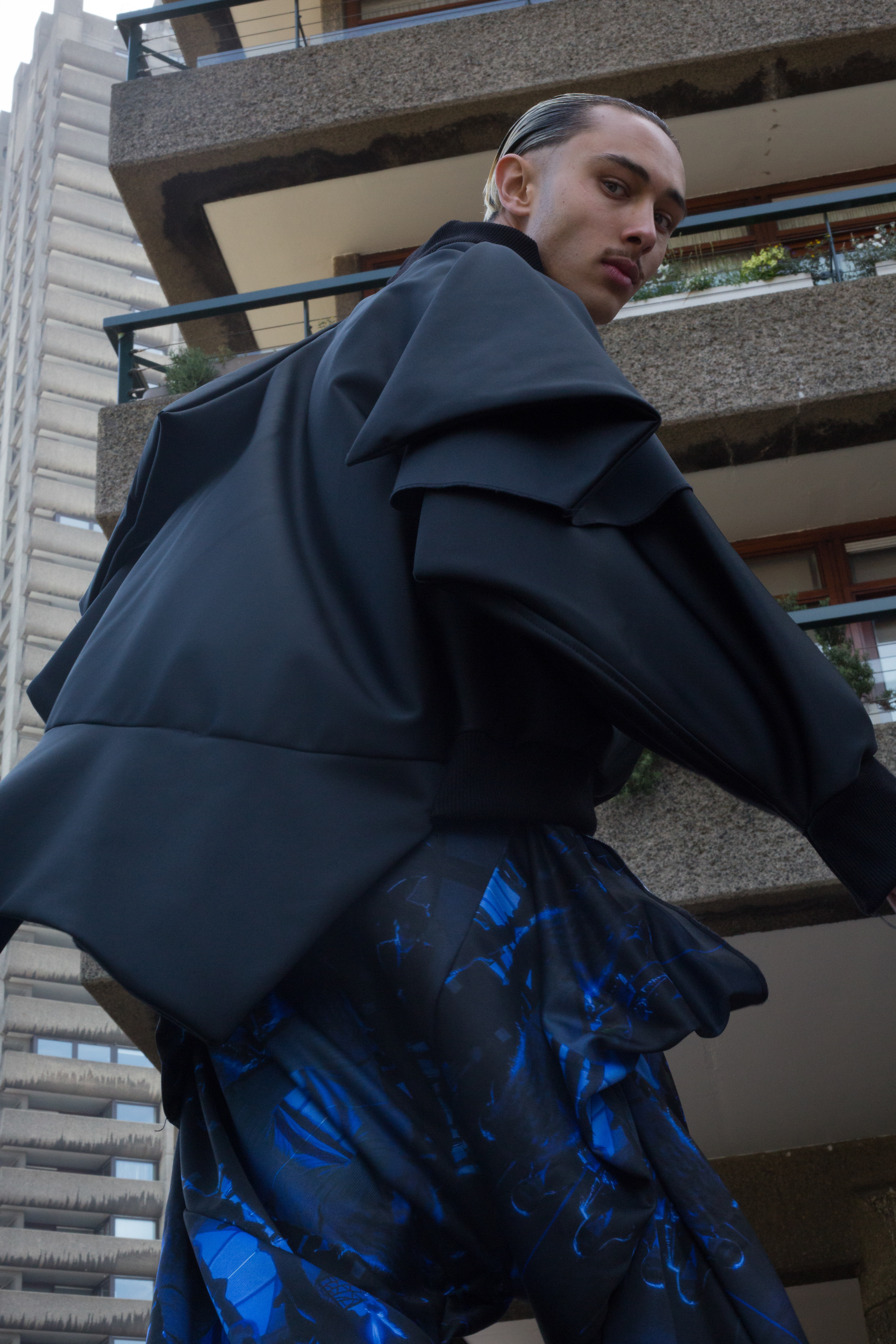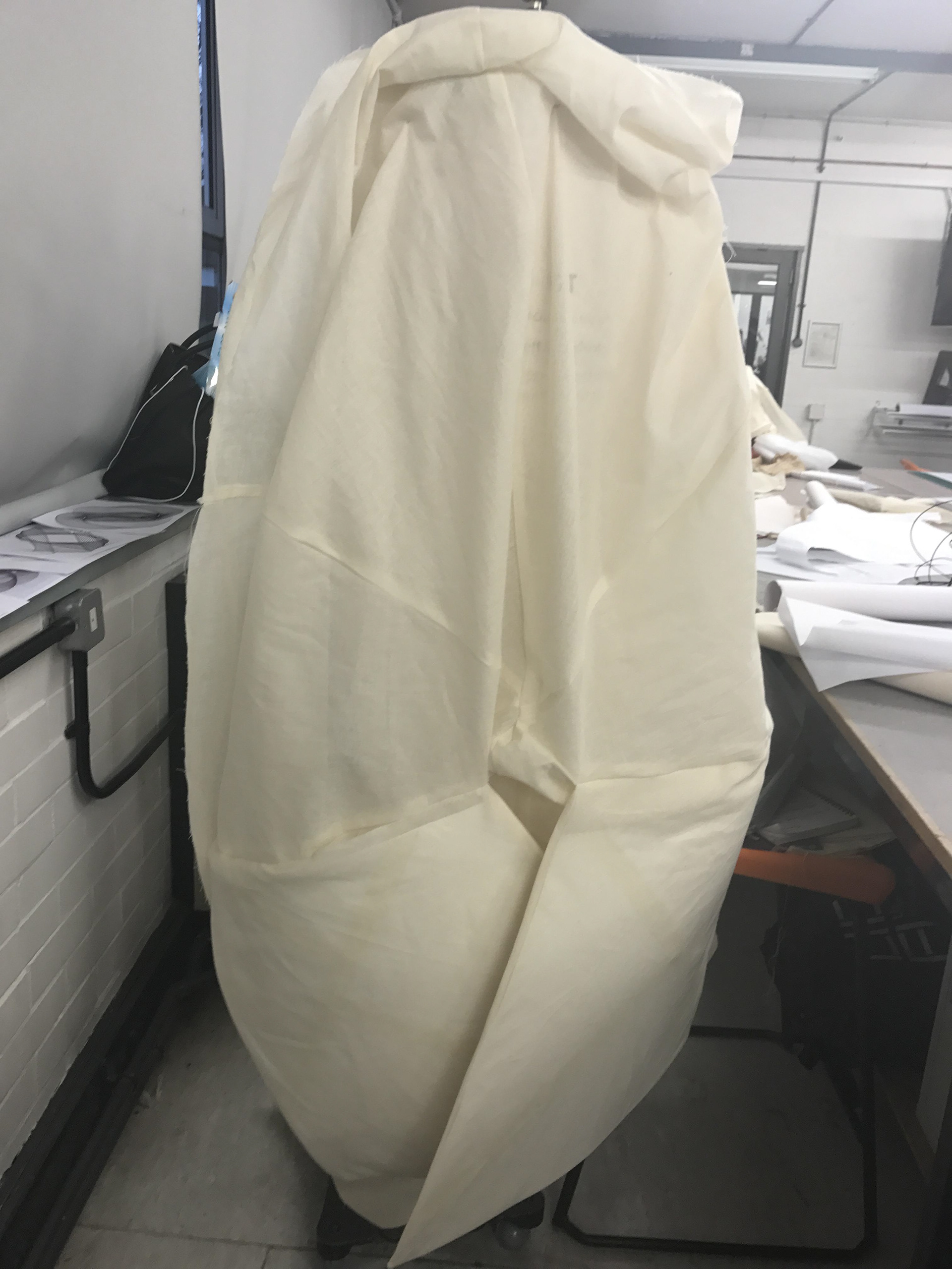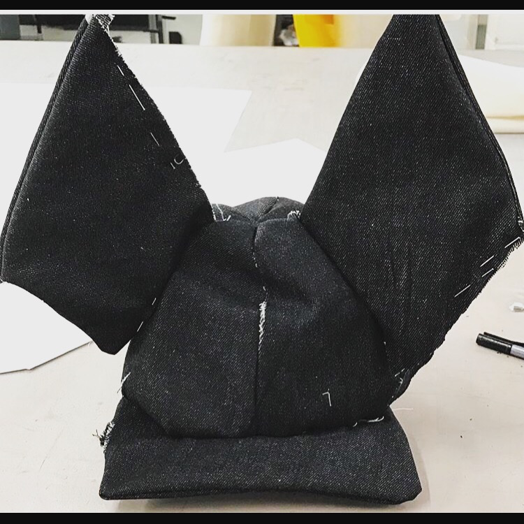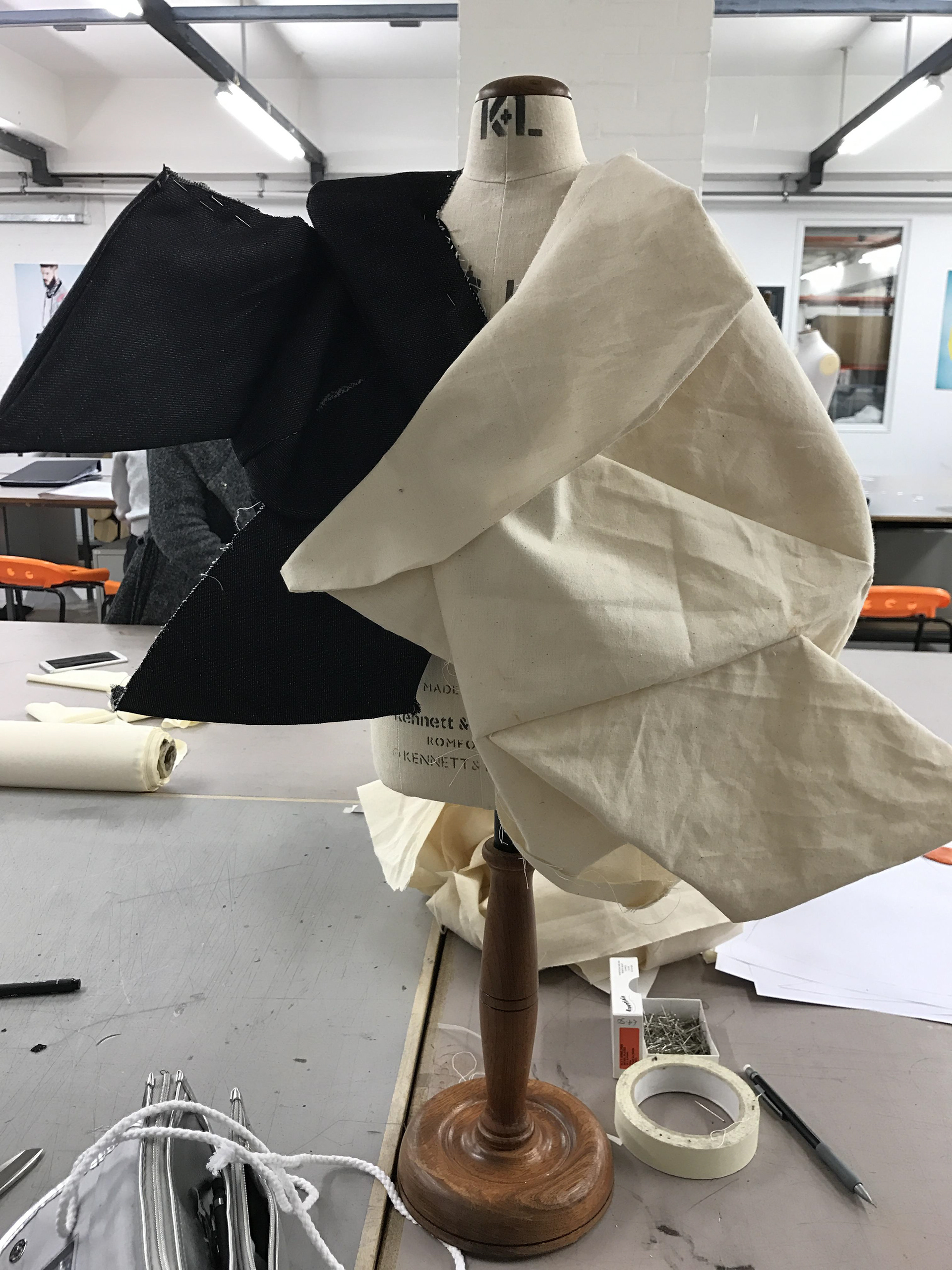 Year 2 design and make project inspired by samurai headgear. Hat, Trouser and jacket all the same pattern by draped differently. Print inspired by Kill Bill